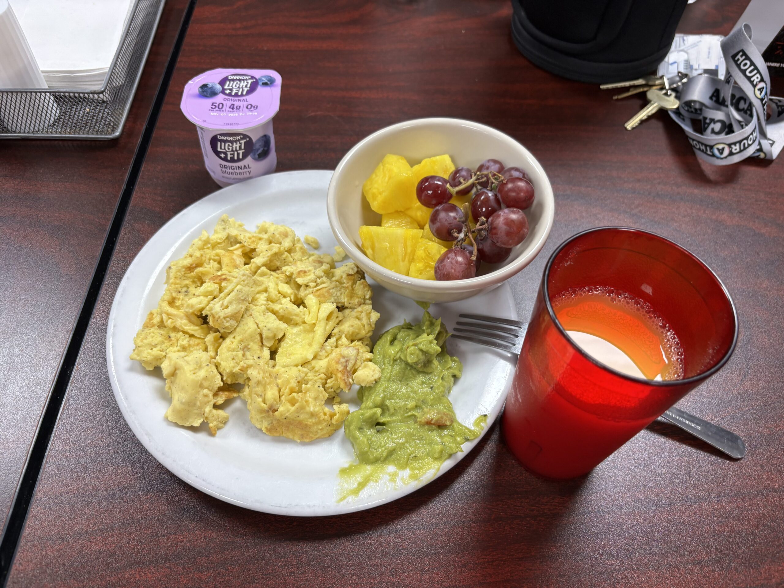 学期始めは朝6時前には起きてウエイトやストレッチをしていたのですが、学校が始まるとバイトや野球のスケジュールで夜が遅くなることが多くとても不規則なスケジュールになってしまったので結局朝は寝れるだけ寝るというルーティンに落ち着きました。朝ごはんは7:30から食べられて、私の場合はスクランブルエッグ,ワカモレ,ソーセージ,フルーツにヨーグルトという組み合わせが多いです。